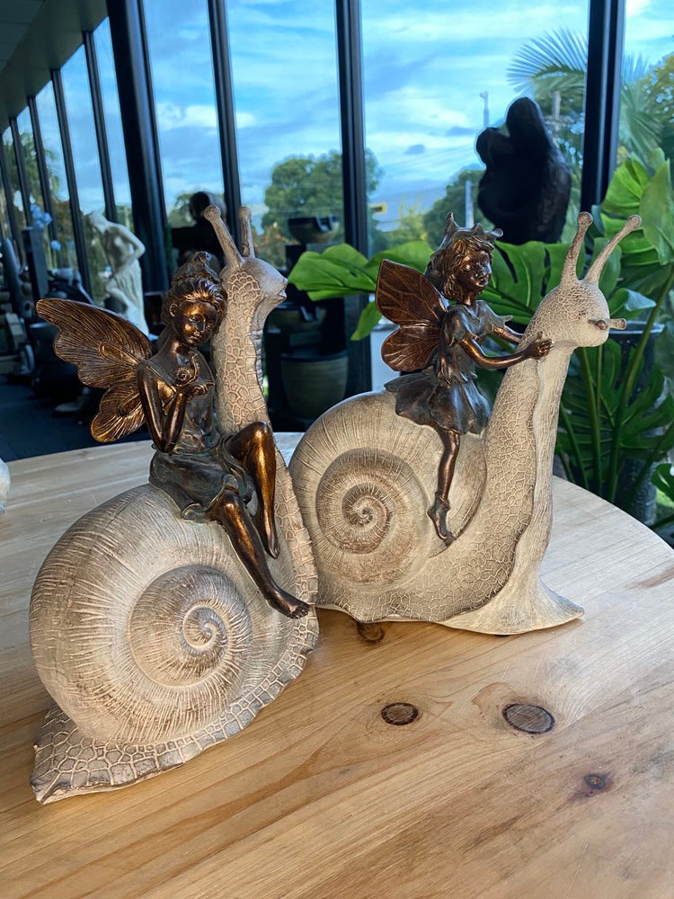 Our new designed Pixie on a snail shaped garden ornament with serene beautiful fairy in copper bronze & blue whilst the snail is in natural stone colour.