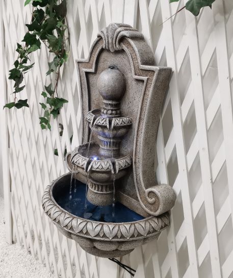 Madrid is a beautifully detailed wall fountain with a round top ball motif will be a lovely addition to your garden. It will be a wonderful focal point wherever you decide to place it. The water recirculates and gently pours out from the upper ball down into the lower levels before reaching reservoir at the bottom, creating a calm and relaxing atmosphere guaranteed to enliven your special space.