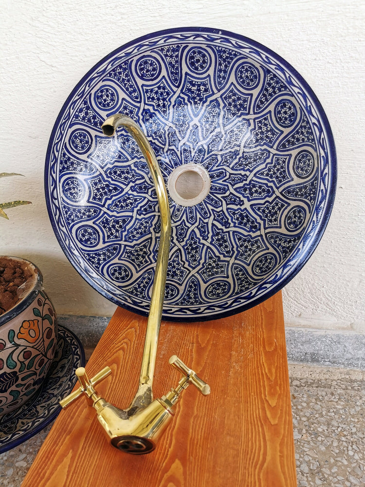 this amazing traditional Moroccan sink was handcrafted by professional workers, it represents the cultural diversity of Moroccan handcrafts and that is because of its design, material and the natural colors used at the surface of the sink, the height of this amazing piece of art is possibility of personal customization. by obtaining such objects you would be helping a dying craft to flourish again so that contact between the past and the present would never die not mentioning the happiness it would bring to poor workers on fields like this .