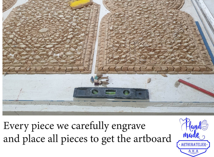 Zellīj or Mosaic is a style of mosaic tile work made from individually hand-chiseled tile pieces set into a plaster base and we place them in an iron surround .