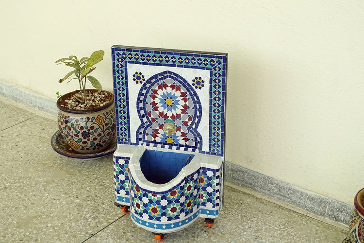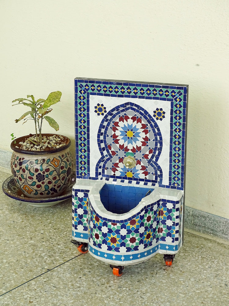 this amazing traditional Fountain was handcrafted by A professional worker, it represents the cultural diversity of Moroccan handcrafts and that is because of its design, material and the colors used at the surface of the fountain, by obtaining such objects you would be helping a dying craft to flourish again so that contact between the past and the present would never die not mentioning the happiness it would bring to poor workers on fields like this .
