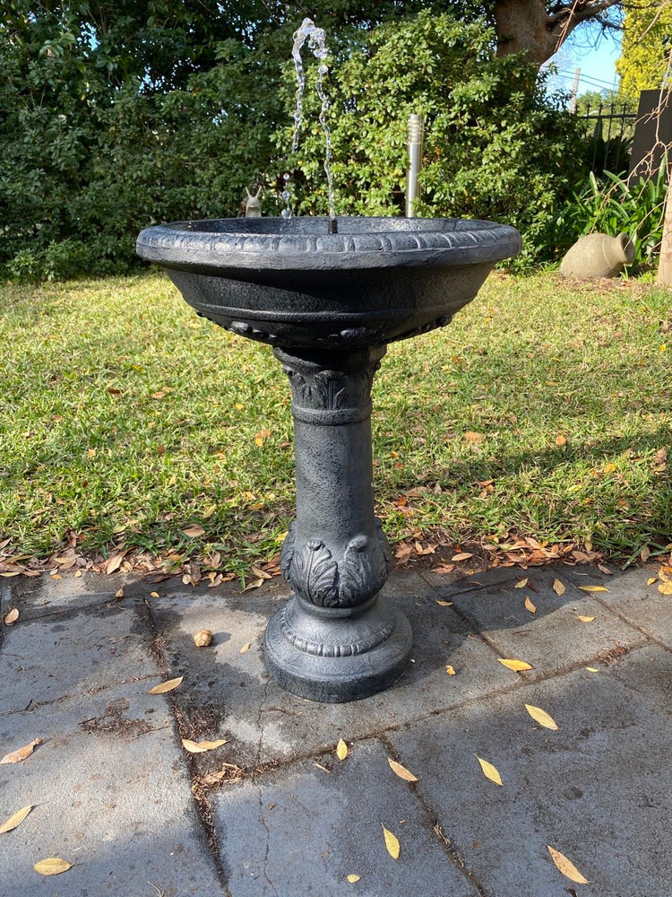 This water feature is striking in dark polyresin, reminiscent of Victorian iron garden ornaments. Add a touch of classical style to any space in your garden. This product is self-contained and solar powered, meaning you can position it anywhere, even paved or decked areas.