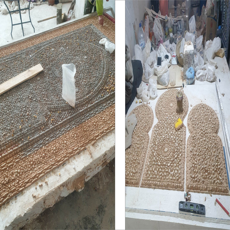 Zellīj or Mosaic is a style of mosaic tile work made from individually hand-chiseled tile pieces set into a plaster base and we place them in an iron surround .